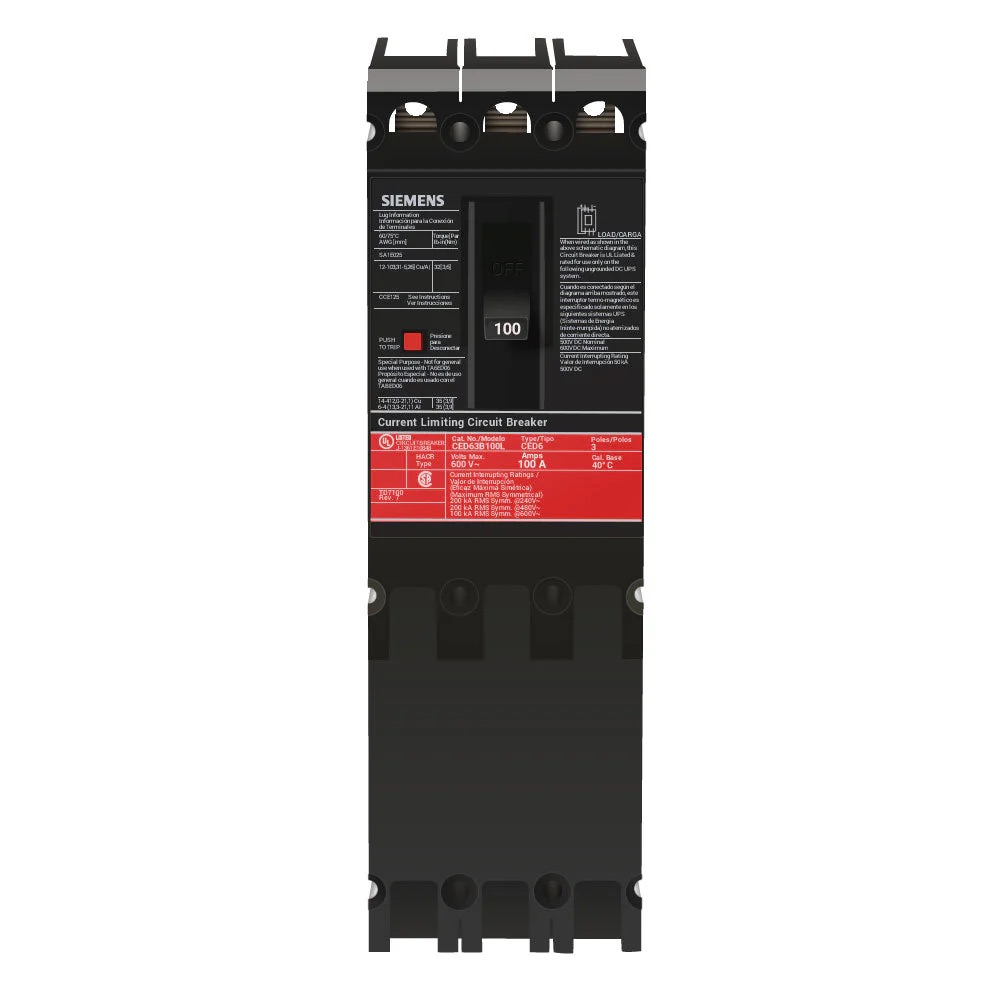 Siemens CED63B100L is a 3 Pole thermal magnetic molded case circuit breaker with a current rating of 100 Amps and a voltage rating of 600V. It has an interrupting rating of 100kAIC at 600V, 200kAIC at 480V. The CED63B100L has a feed-thru connection type and includes long time and instantaneous trip functions.