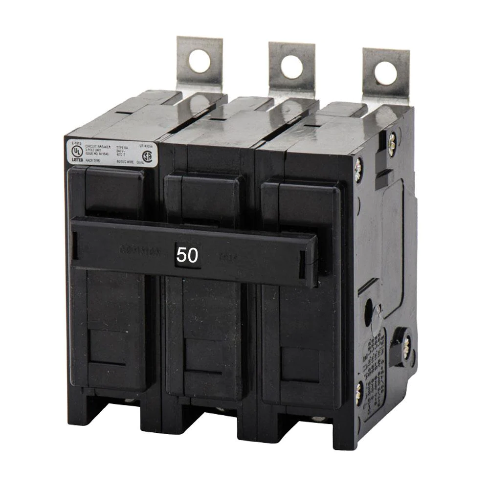 Eaton / Cutler-Hammer Bolt-On Circuit Breaker Its Compact And Easy to Install three poles thermal-magnetic circuit breaker has a current rating of 60 amps at 40 deg c and voltage rating of 240 Vac it has an interrupt current rating of 10 kilo-amps it accommodates aluminum/copper wire of size 8 to 1/0 AWG at load it has extended tang line terminal and box lug load terminal for convenient connection it has bolt-on type connection it is suitable for industrial applications circuit breaker is Ul 489 listed and Csa certified.