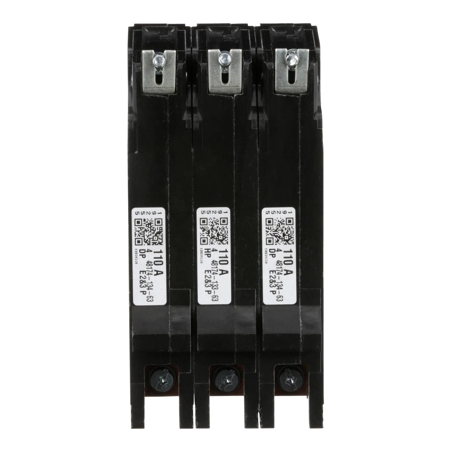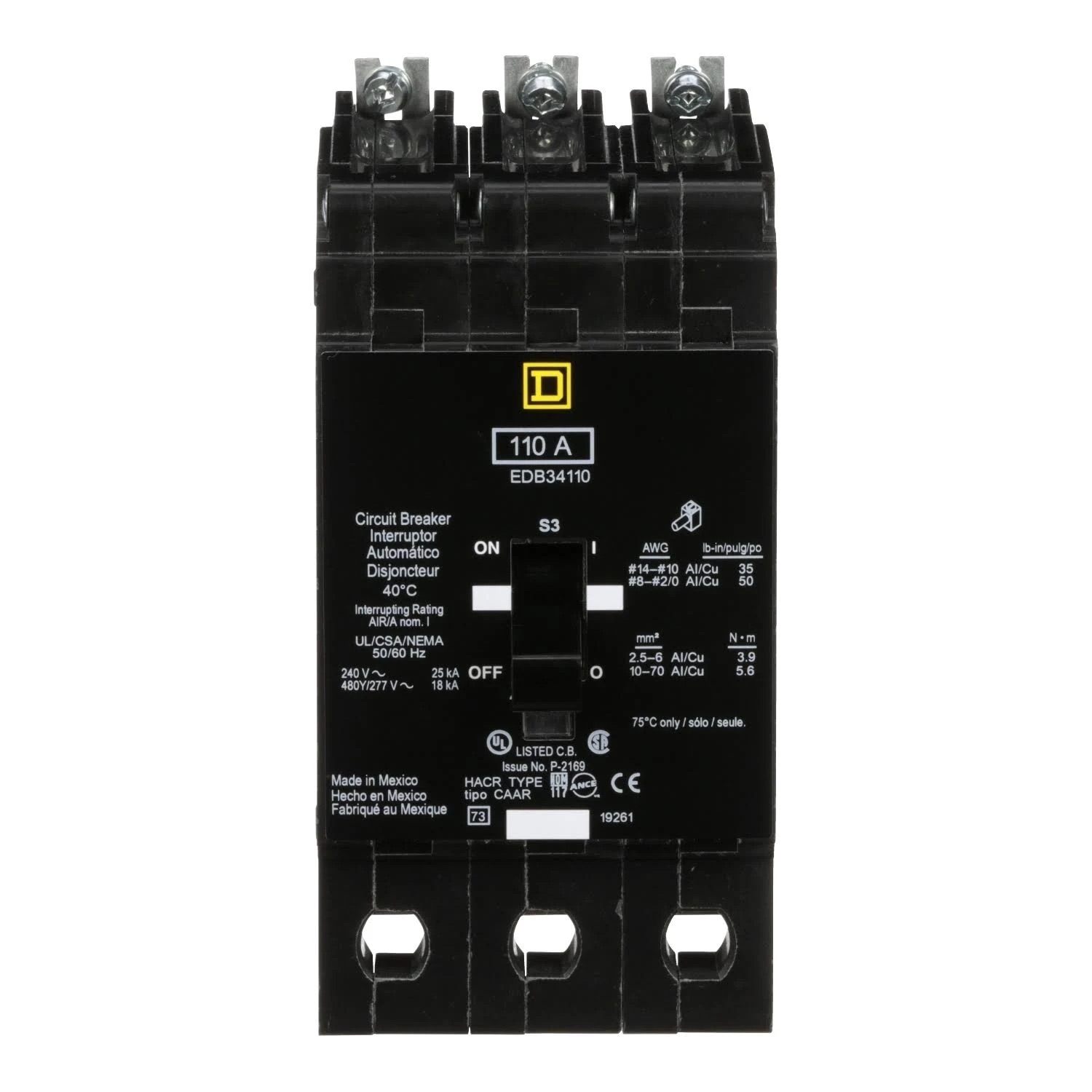 The Square D EDB34110 is a 3 Pole thermal magnetic molded case circuit breaker with a current rating of 110 Amps and a voltage rating of 480Y/277VAC, 125/250VDC. It has an interrupting rating of 18kA at 277/480VAC. The EDB34110 has a bolt-on mounting type and includes long time and instantaneous trip functions.