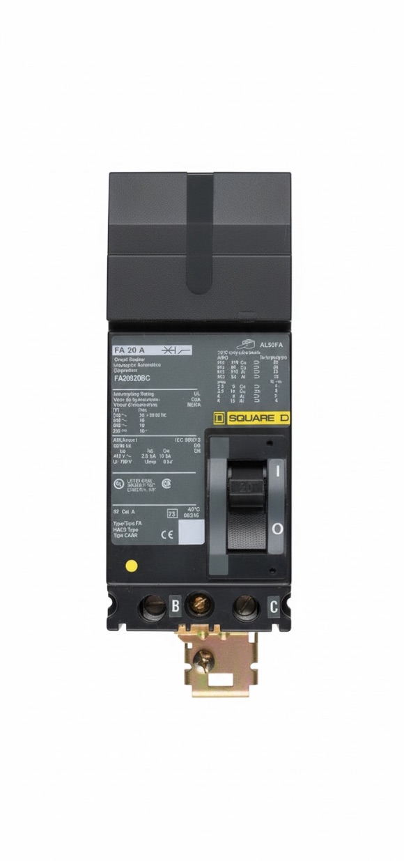 The Square D FA26020BC is a 2 Pole thermal magnetic molded case circuit breaker with a current rating of 20 Amps and a voltage rating of 600VAC, 250VDC. It has an interrupting rating of 25kAIC at 240V, 18kAIC at 480V, 14kAIC at 600V. The FA26020BC has an I-Line mounting type and includes long time and instantaneous trip functions.