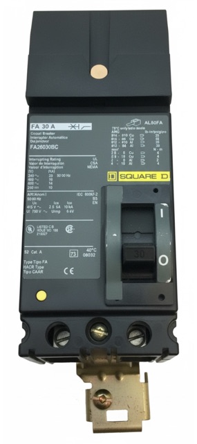 The Square D FA26030BC is a 2 Pole thermal magnetic molded case circuit breaker with a current rating of 30 Amps and a voltage rating of 600VAC, 250VDC. It has an interrupting rating of 25kAIC at 240V, 18kAIC at 480V, 14kAIC at 600V. The FA26030BC has an I-Line mounting type and includes long time and instantaneous trip functions.