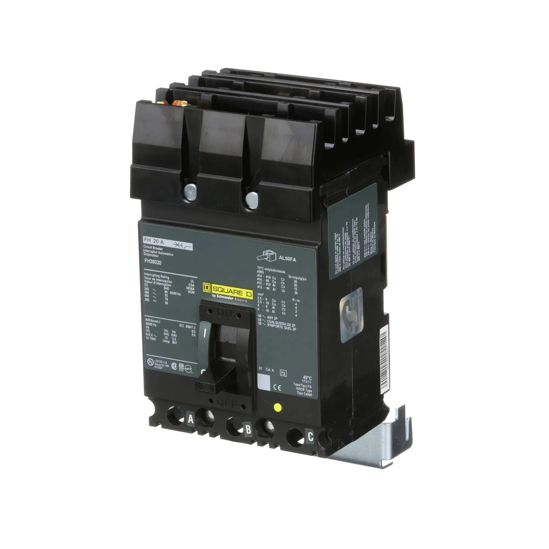 The Square D FH36020 is a 3 Pole thermal magnetic molded case circuit breaker with a current rating of 20 Amps and a voltage rating of 600VAC. It has an interrupting rating of 25kAIC at 480V. The FH36020 has an I-Line style plug-in connection type and includes LI - long-time and instantaneous trip functions.