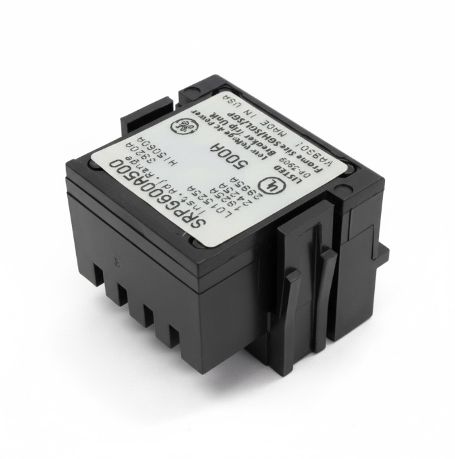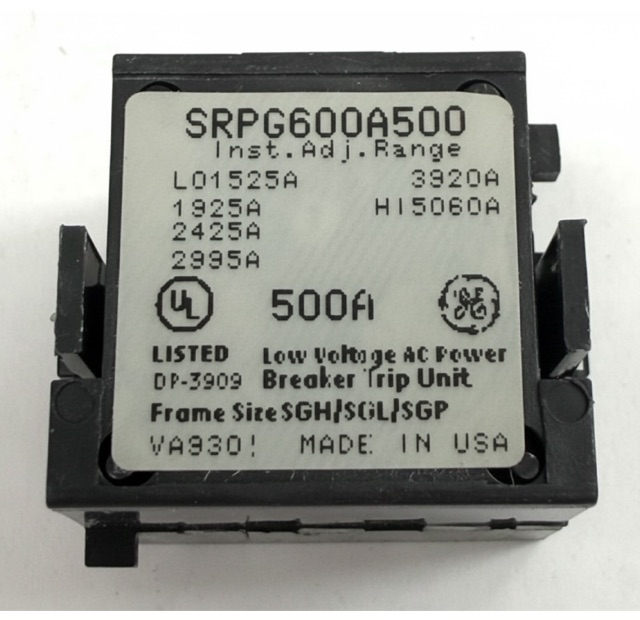 The General Electric SRPG600A500 is a circuit breaker rating plug with a current rating of 500 Amps and a voltage rating of 600VAC. It is used for 600A sensor rating, SG series - SGDA, SGHA, SGLA, SGPA molded case circuit breaker frame types and Microversatrip-Plus, Microversatrip-PM solid state electronic trip units and circuit breakers.