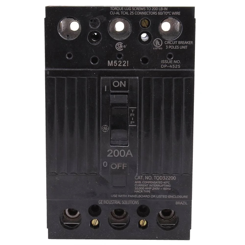 The General Electric TQD32200 is a 3 Pole thermal magnetic molded case circuit breaker with a current rating of 200 Amps and a voltage rating of 240V. It has an interrupting rating of 10kAIC at 240V. The TQD32200 has a bolt-on connection type and includes LI - long-time and instantaneous trip function.