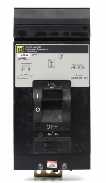 Square D, I-Line, type LA, 3P, ABC phase circuit configuration, 3PH, 400A, 600V, 30kA@480V, standard interrupting capacity, i-line style plug-in, complete with LI - Long-Time and Instantaneous trip functions, thermal magnetic molded case circuit breakers.