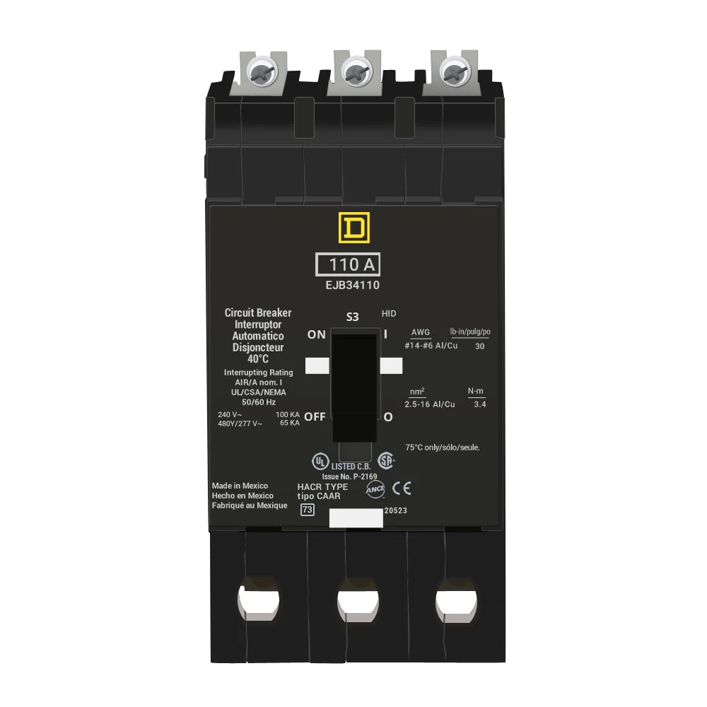 The Square D EJB34110 is a 3 Pole thermal magnetic molded case circuit breaker with a current rating of 110 Amps and a voltage rating of 480Y/277VAC. It has an interrupting rating of 65kA at 120/240/277VAC, 100kA at 120VAC. The EJB34110 has a bolt-on connection type and includes long time and instantaneous trip functions.