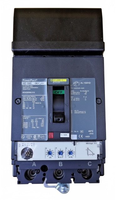 The Square D HDA36060U31X is a 3 Pole solid state molded case circuit breaker with a current rating of 60 Amps and a voltage rating of 600V. It has an interrupting rating of 25kAIC at 240VAC, 18kAIC at 480VAC, 14kAIC at 600VAC. The HDA36060U31X has an I-Line style plug-in connection type and includes Long Time and Instantaneous Trip functions.