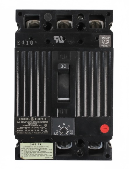 The General Electric TEC36030 is a 3 Pole magnetic molded case circuit breaker with a current rating of 30 Amps and a voltage rating of 600VAC. It has an interrupting rating of 10kAIC at 480V. The TEC36030 has a feed-thru connection type and includes instantaneous trip function.