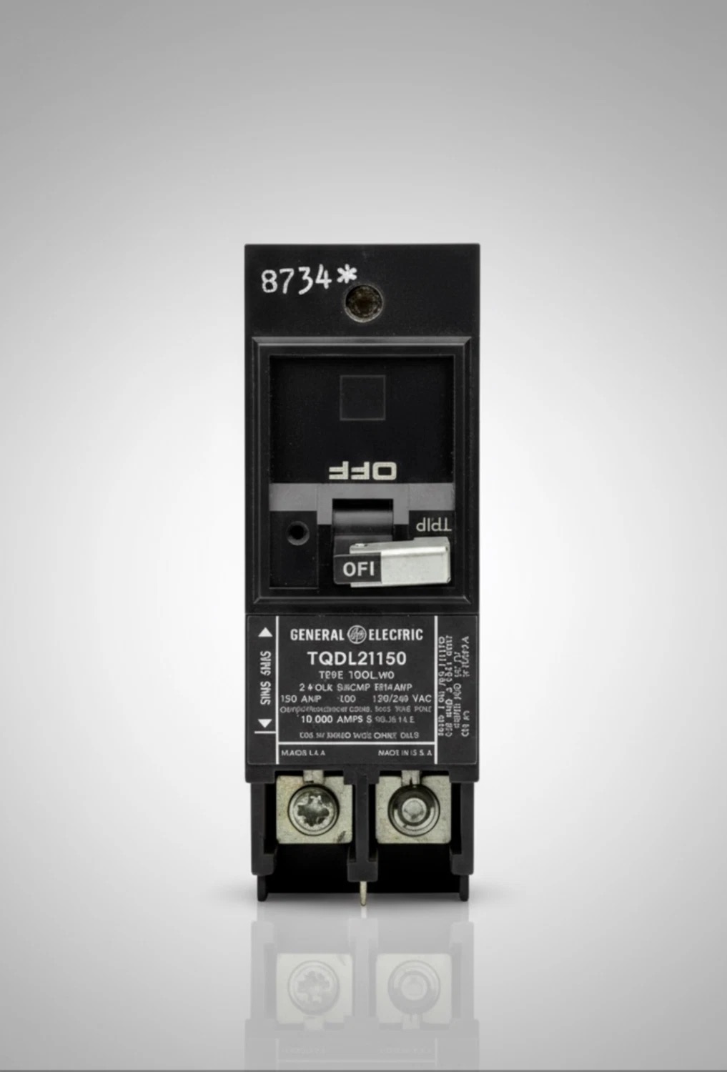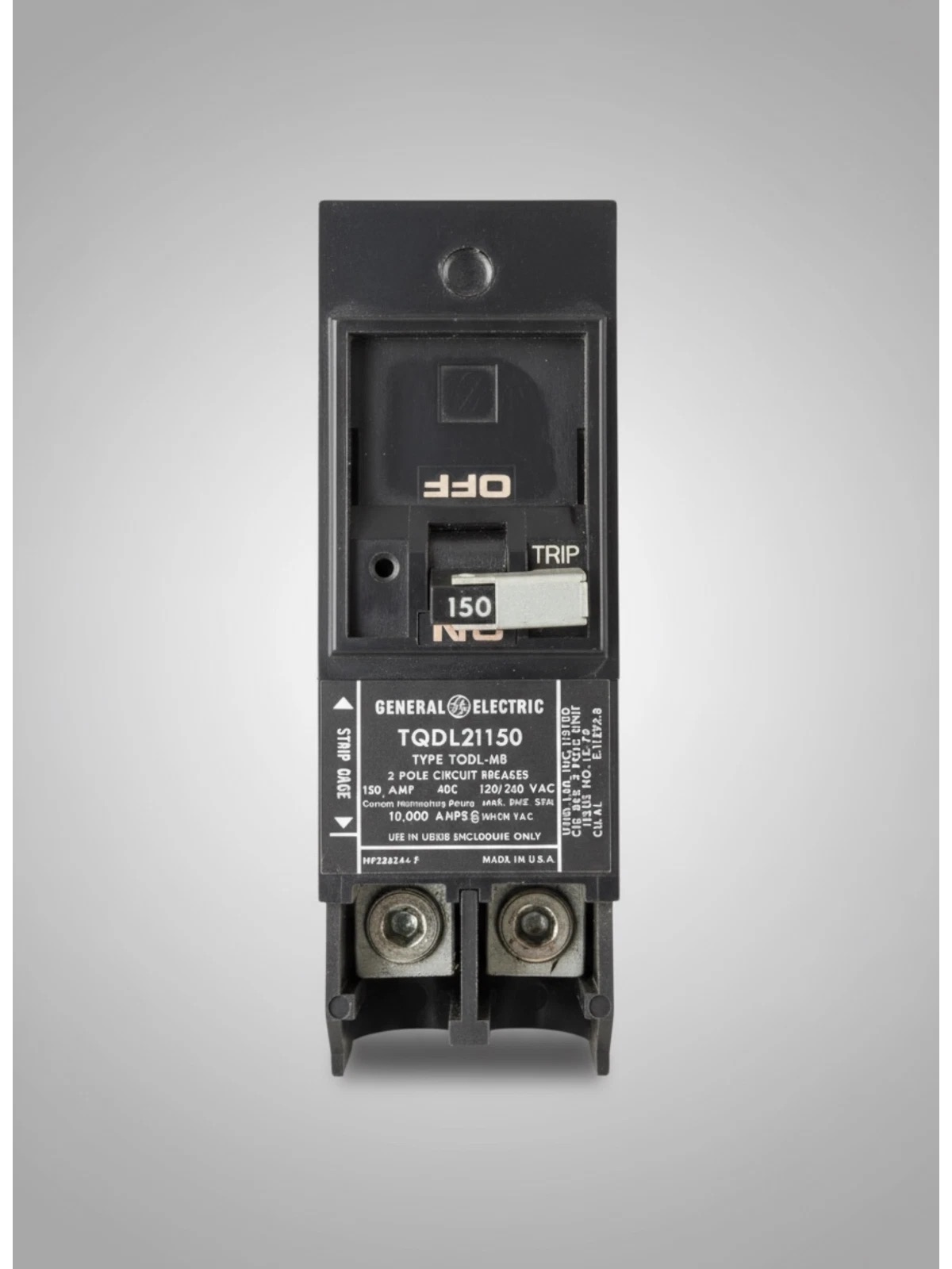The General Electric TQDL21150 is a 2 Pole thermal magnetic molded case circuit breaker with a current rating of 150 Amps and a voltage rating of 120/240VAC. It has an interrupting rating of 10kAIC at 120V. The TQDL21150 has a plug-in connection type and includes LI - long-time and instantaneous trip functions.
